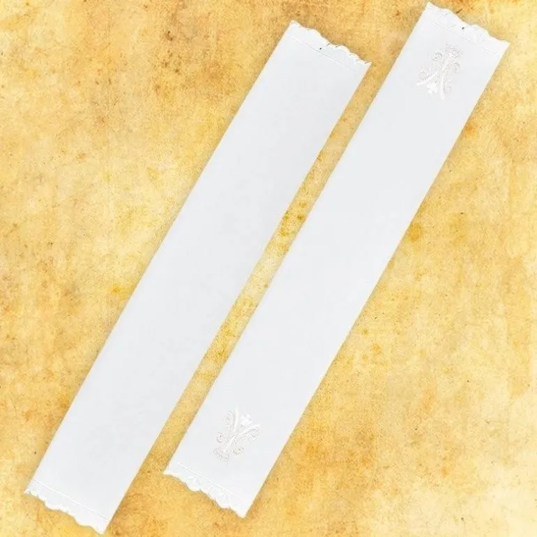 -pale brodée : 20 cm x 20 cm ( dedans: un carré de plastique déhoussable pour le lavage) / corporal brodé : 45 cm x 45 cm / purificatoire brodé : 23 cm x 45 cm / manuterge à ourlet brodé : 23 cm x 45 cm